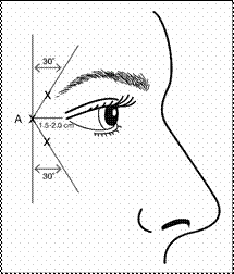 Injections should be given with the needle bevel tip up and oriented away from the eye. Inject 4 Units/0.1 mL of reconstituted BOTOX Cosmetic into 3 sites per side (6 total injection points) in the lateral orbicularis oculi muscle for a total of 24 Units/0.6 mL (12 Units per side). The first injection (A) should be approximately 1.5-2.0 cm temporal to the lateral canthus and just temporal to the orbital rim. If the lines in the lateral canthal region are above and below the lateral canthus, inject per Figure 2. Alternatively, if the lines in the lateral canthal region are primarily below the lateral canthus, inject per Figure 3.